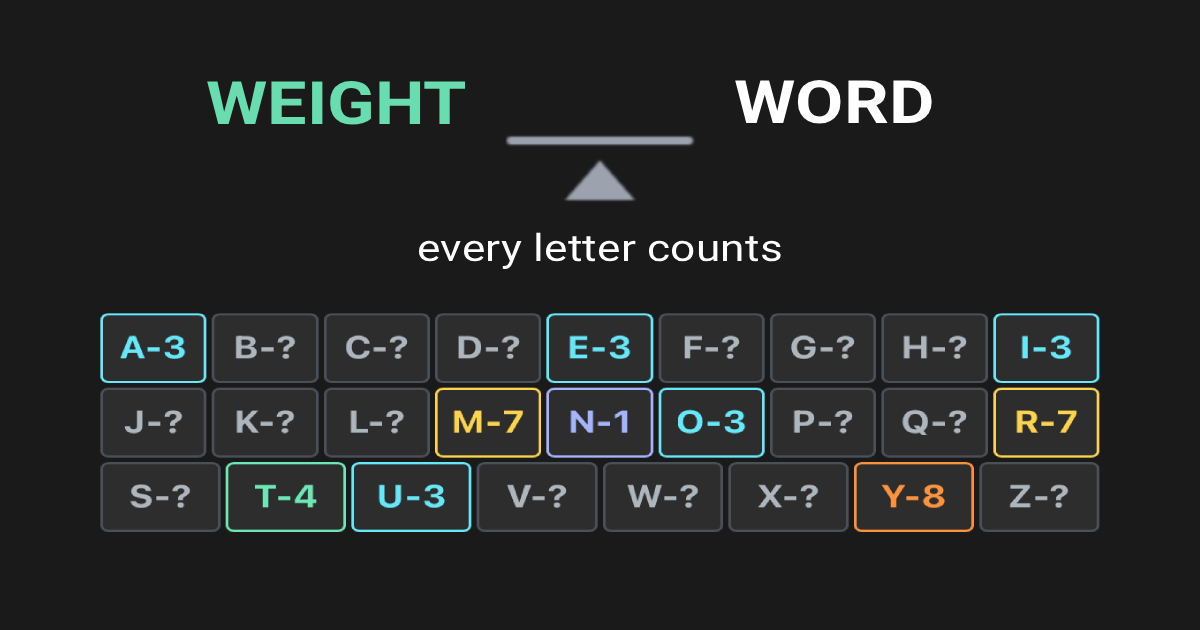 Real-time weight counter: As you type your guess, the balance scale updates to show the total weight of discovered letters. Unknown letters don't count toward the displayed total until you discover them.